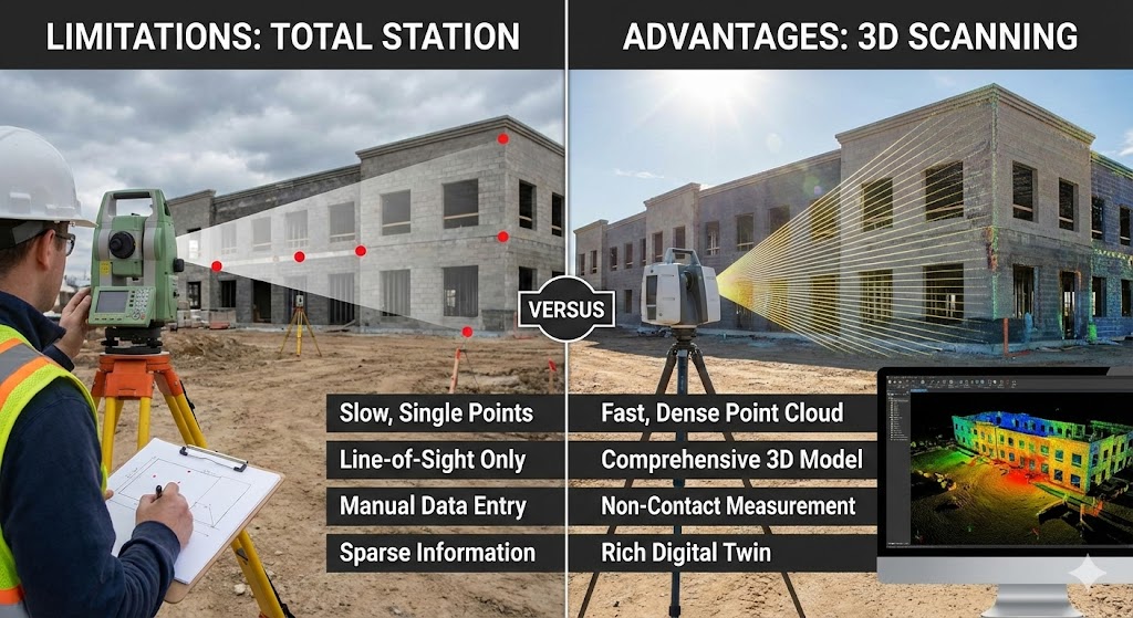 비정형 건축물이 늘어나면서 형태는 점점 더 복잡해지고 있습니다. 하지만 현장에서는 여전히 사람이 직접 '점'을 찍어 측정하는 전통적인 측량 방식(토탈 스테이션 등)을 사용하는 경우가 많습니다.