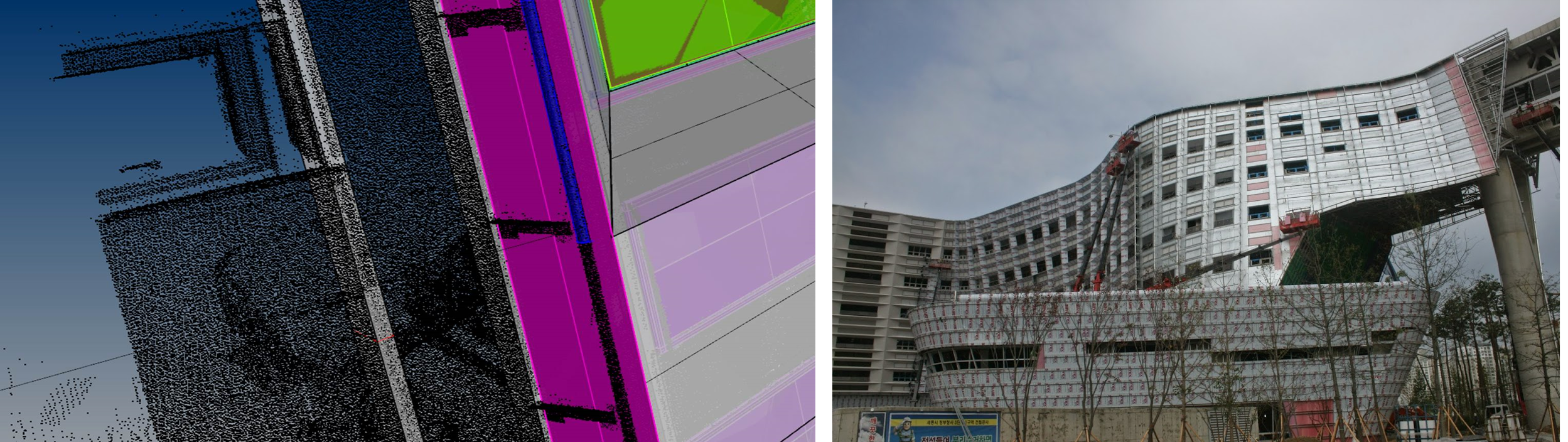 - 3D 스캐닝: 시공된 철골과 슬라브를 스캔하여 Point Cloud 데이터를 확보했습니다.