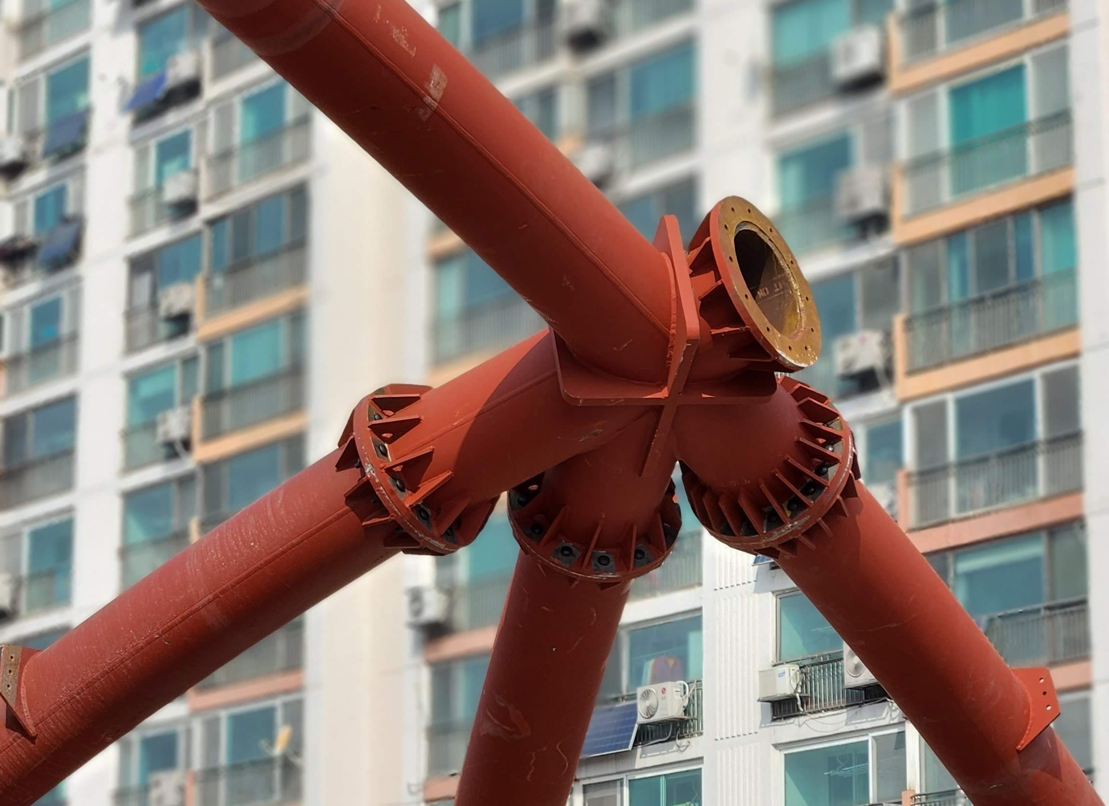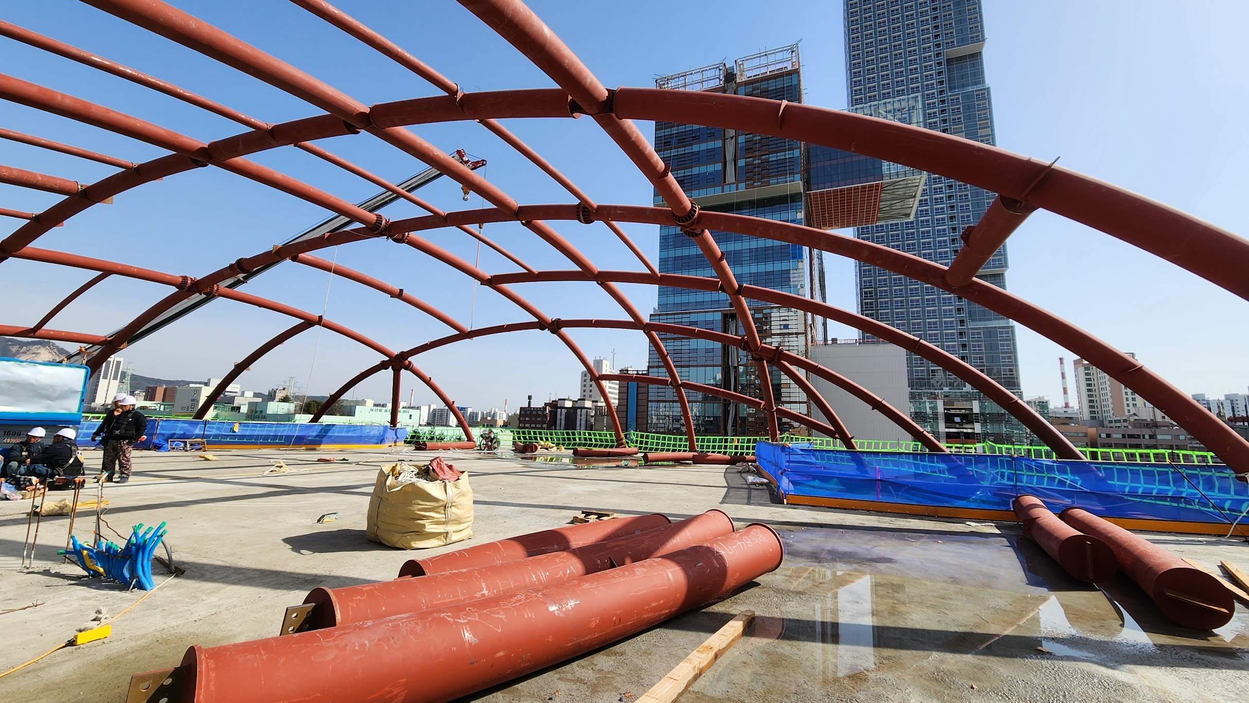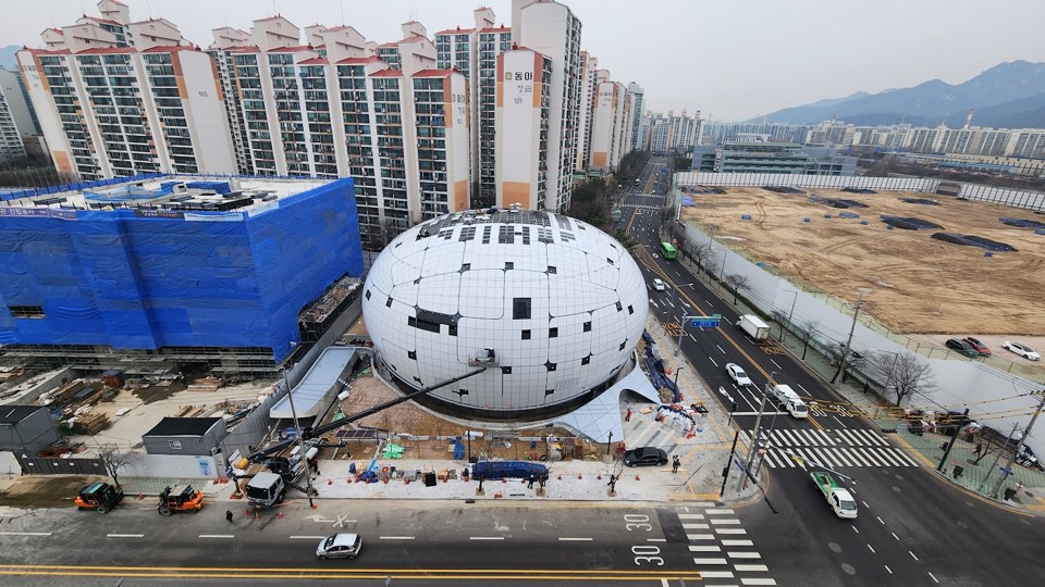 내부와 외부의 거대한 LED 스크린이 단 하나의 픽셀 오류처럼 보이는 뒤틀림 없이 완벽한 구면을 이루기 위해, 철골 구조의 제작 및 조립 허용 오차는 몇 밀리미터(mm) 이내로 엄격하게 관리되었습니다. 이는 16K 스크린의 왜곡, 이음새, 데드 픽셀을 방지하기 위한 타협 불가능한 조건이었습니다. - 현장 작업 최소화 (Minimizing On-site Work)