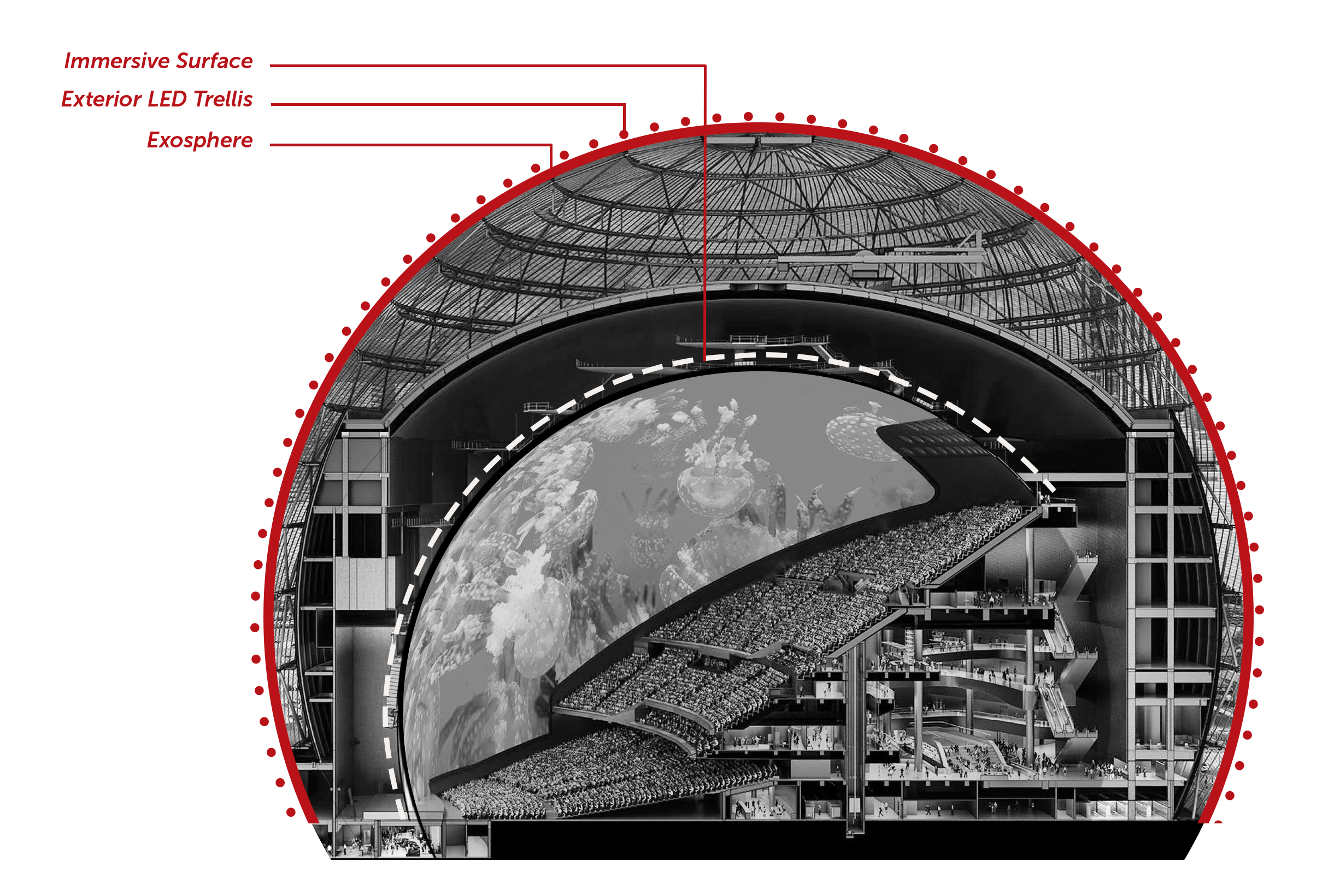 - 내부 구조 (Inner Sphere): 관객석, 무대, 거대한 내부 LED 스크린 및 음향 시스템을 지지하는 핵심 공연장입니다. 외부의 하중과 독립적인 구조 시스템으로 되어 있습니다.