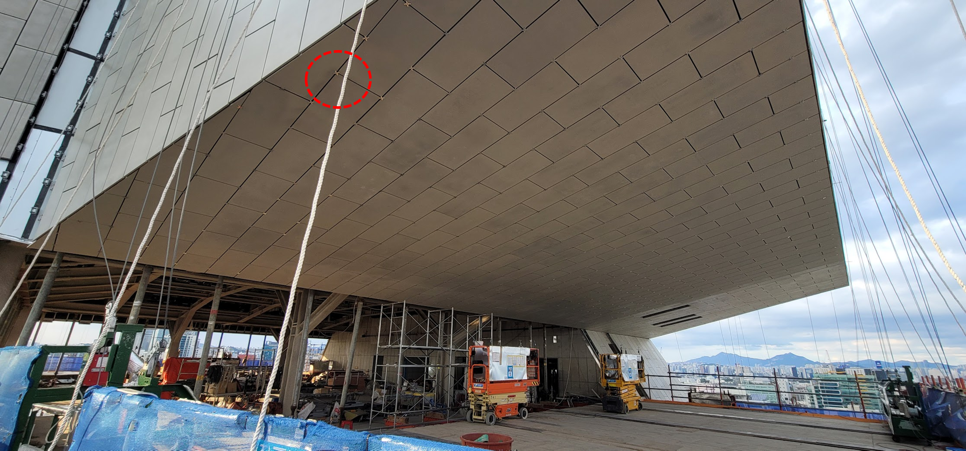 비정형 건축의 승부처는 정밀하게 만나는 '엣지(Edge)'입니다. 위드웍스는 실물 크기 목업(Mock-up)을 통해 엣지의 시공 품질과 오픈 조인트와 UHPC 패널의 시공 디테일을 검토하고 최종 UHPC 패널의 제작 및 시공디테일에 반영하였습니다. 또한 돌풍 시 발생하는 천장 구간의 부압을 고려한 탈락 방지 디테일을 추가하여 외장재의 구조안전을 확보하였습니다.