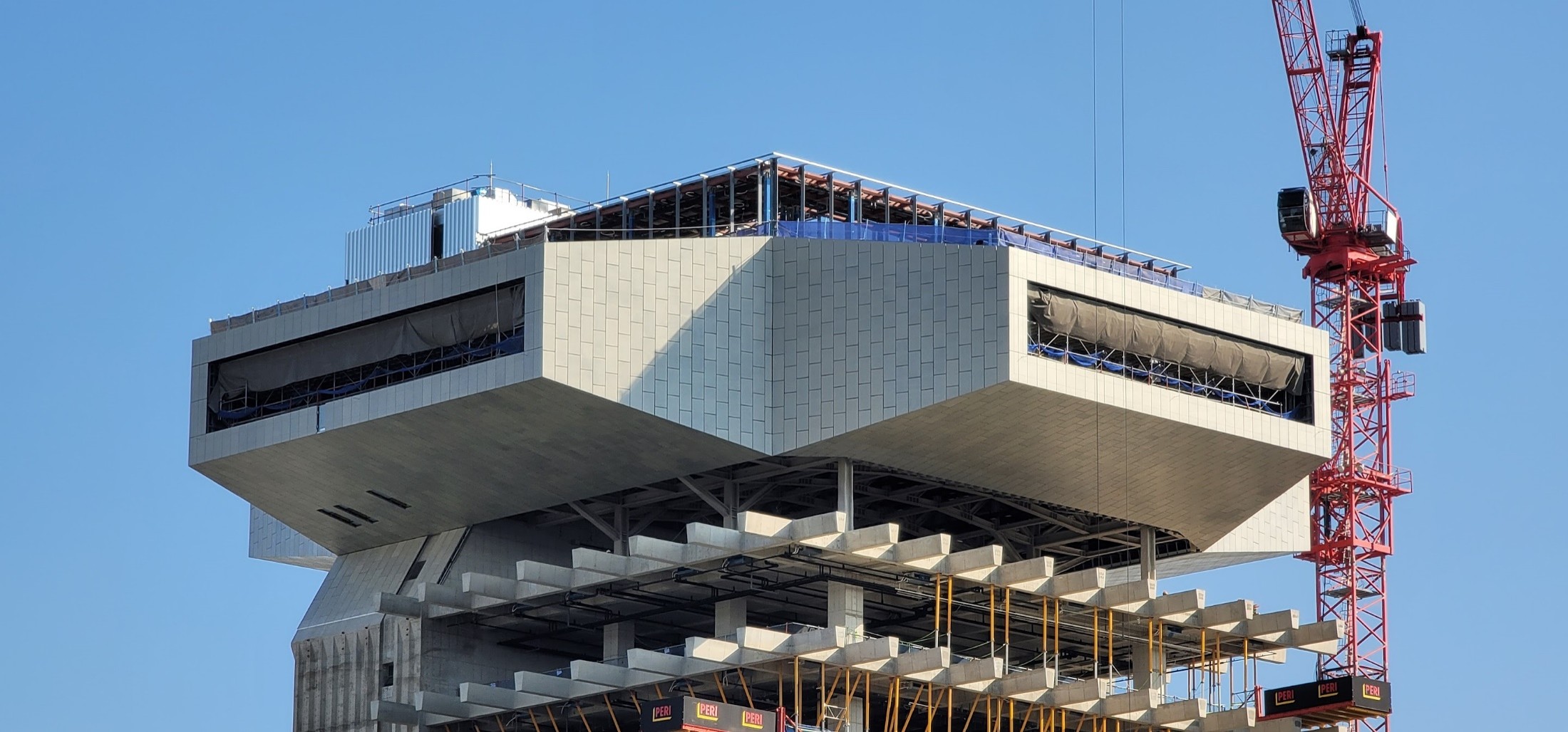 성수동 젠틀몬스터 신사옥은 비정형 건축 설계가 실물 시공 단계에서 시각적·구조적 무결성을 유지한 대표적인 사례입니다. 본 프로젝트는 초기 설계안의 조형미를 물리적으로 완벽히 구현하기 위해 고도의 엔지니어링 기술이 투입되었습니다. 특히 위드웍스에서 진행한 고층부 캔틸레버(Cantilever) 구간은 구조적 안정성과 정밀 시공의 핵심 지점입니다.